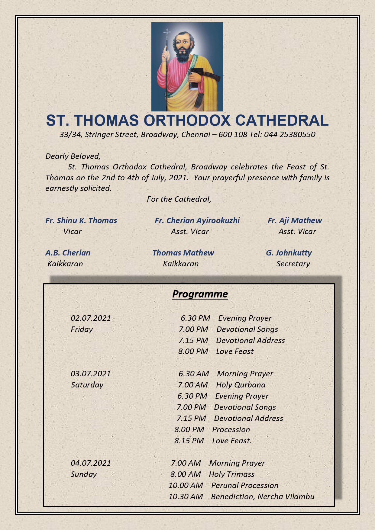 St. Thomas Orthodox Cathedral Broadway,Chennai-108 ,celebrates the Feast of St. Thomas on the 2nd to 4th of July 2021.